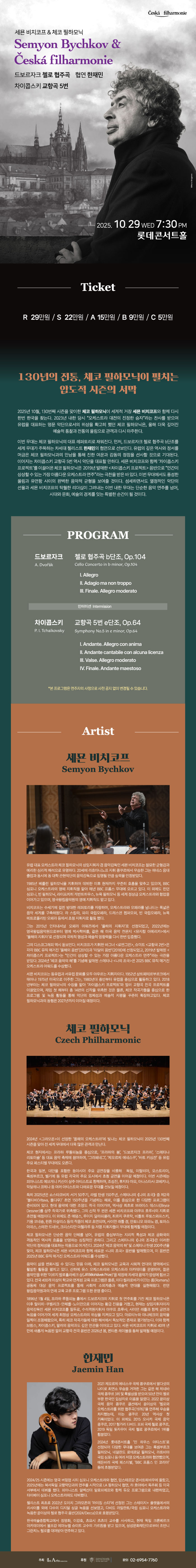 이번 무대는 체코 필하모닉의 대표 레퍼토리로 채워진다. 먼저, 드보르자크 첼로 협주곡 b단조를 세계 무대가 주목하는 차세대 첼리스트 한재민의 협연으로 선보인다. 유럽의 깊은 역사와 정서를 머금은 체코 필하모닉과의 만남을 통해 진한 여운과 감동의 정점을 선사할 것으로 기대된다. 이어지는 차이콥스키 교향곡 5번 역시 악단을 대표할 만하다. 세묜 비치코프와 함께 ‘차이콥스키 프로젝트’를 이끌어온 체코 필하모닉은 2019년 발매한 <차이콥스키 프로젝트> 음반으로 “인간이 상상할 수 있는 가장 아름다운 오케스트라 연주”라는 극찬을 받은 바 있다. 이번 무대에서도 풍성한 울림과 유연함 사이의 완벽한 음악적 균형을 보여줄 것이다. 섬세하면서도 열정적인 악단의 선율과 세묜 비치코프의 탁월한 리더십이 그려내는 이번 내한 무대는 단순한 음악 연주를 넘어,